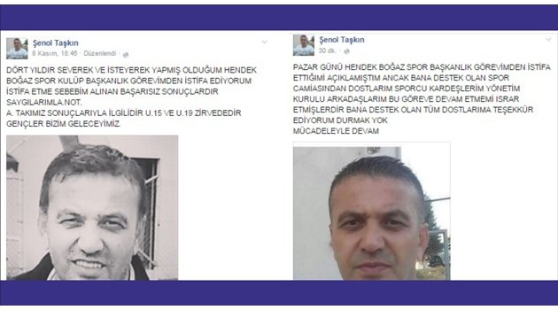 Şenol Taşkın, Pazar günü alınan başarısız sonuç nedeniyle görevinden istifa ettiğini sosyal medya hesabından açıklamıştı, 11 Kasım itibariyle yayınladığı ikinci mesajında ise, gelen ısrarlar üzerine kulüp başkanlığı görevine devam etme kararı aldığını duyurdu.Başarısız Sonuçları Gerekçe GöstermiştiTaşkın, 8 Kasım günü Facebook’ta “Dört yıldır severek ve isteyerek yapmış olduğum hendek boğaz spor kulüp başkanlık görevimden istifa ediyorum.