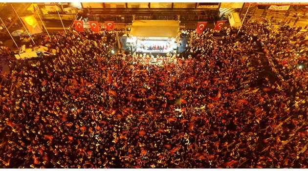 Demokrasi Meydanı’nda gerçekleştirilen mitingde konuşan Başkan Toçoğlu, “Bu hainler bu alanı, demokrasi mücadelemizin simgesi Kent Meydanı’nı da bombalamayı düşünmüşler. Alçaklara gereken dersi verdik” derken; AK Parti Genel Başkan Yardımcısı Dişli, “Bu meydanları terk etmeyeceğiz. Gündüz işimizin başında akşamları da meydanlarda olacağız” ve Vali Coş, “Üniforma giymiş 3-5 terör örgütü mensubunun bu millete istikamet veremeyeceğini çok iyi gösterdiniz” ifadelerini kullandı.