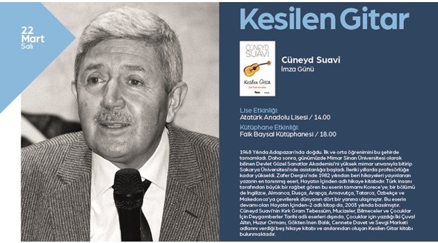 Sakarya Büyükşehir Belediyesi Kültür ve Sosyal İşler Dairesi Başkanlığı tarafından düzenlenen Mart kültür sanat Etkinlikleri devam ediyor. Yapılan açıklamada; “Mart Kültür Sanat Etkinlikleri 22 Mart Salı günü Yazar Cüneyd Suavi’nin katılımı ile gerçekleşecek söyleşi ve imza günü programları ile devam edecektir. İlk olarak Atatürk Anadolu Lisesi öğrencileri ile saat 14.00’da bir araya gelecek olan Yazar Cüneyd Suavi, saat 18.00’da Faik Baysal Kütüphanesi’nde katılımcılar ile buluşacaktır. ‘Kesilen Gitar’ adlı kitabının tanıtımı ve imza töreninin yapılacağı programlara tüm kültür sanat dostları davetlidir” denildi.