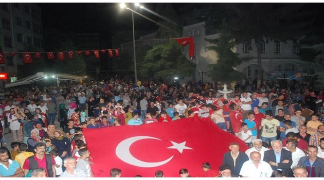 KOCAALİ TEK YUMRUKEllerinde Türk bayraklarıyla sokaklara çıkan vatandaşlar tekbir ve dualarla meydanlara akın etti. Kocaali Kaymakamı, Kocaali Belediye Başkanı, ilçe emniyet amiri, polisler, siyasi parti başkanları, STK`lar vatandaşlara destek verdiler.Belediye Başkanı Ahmet Acar; meydanları dolduran vatandaşlara teşekkür etti, Namus, bayrak, vatan için nöbetteyiz Başkomutan Cumhurbaşkanımız “Evinize dönün” değinceye kadar meydanlardayız” dedi.