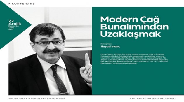 Sakarya Büyükşehir Belediyesi Aralık Kültür Sanat Etkinlikleri 22 Aralık Perşembe günü iki program ile devam edecek. Günün ilk etkinliğinde Yazar Hayati İnanç, ‘Modern Çağ Bunalımından Uzaklaşmak’ konulu konferansta katılımcılar ile buluşacak. Adapazarı Kültür Merkezi’nde gerçekleştirilecek etkinlik saat 19.00’da başlayacak.