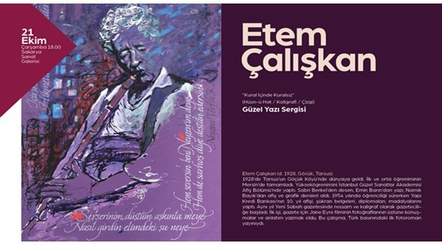 Sakarya Büyükşehir Belediyesi Kültür ve Sosyal İşler Dairesi Başkanlığı tarafından yapılan açıklamada, “Sakarya Sanat Galerisi, 21 Ekim Çarşamba günü ‘Kural İçinde Kuralsız’ Güzel Yazı Sergisi’ne ev sahipliği yapacaktır. Sanatçı Etem Çalışkan’ın özgün eserlerinden oluşan serginin açılış programı saat 18.00’da gerçekleştirilecektir. Açılışımıza tüm sanatseverler davetlidir” ifadelerine yer verildi.