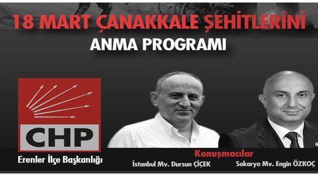 Programa; konuşmacı olarak chp İstanbul Milletvekili Dursun Çiçek, Sakarya Milletvekili Engin Özkoç katılacak. Programla ilgili açıklama yapan CHP Erenler ilçe başkanı Mustafa Çinal, “18 Mart 1915 Türk tarihinde bir askeri ve siyasi başarı olmaktan öte inanç, azim ve yiğitlikle örülmüş bir destanın yaradılış tarihidir. Bu tarih, gerek taarruz gerekse savunma savaşlarının başarılarıyla dolup taşan, Türk kahramanlık tarihinin en onur verici, en parlak sayfalarından biridir.