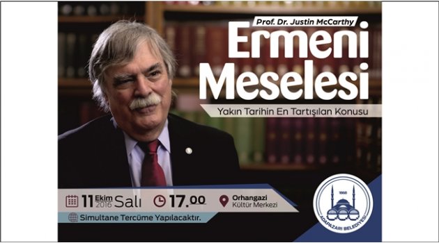 MCCARTHY KİMDİRUzmanlık alanları arasında Osmanlı İmparatorluğu, Balkanlar ve Orta Doğu tarihi olan Mccarthy, Orta Doğu Teknik Üniversitesi ve Ankara Üniversitesi'nde de görev yapmıştır. Doktorasını 1978 yılında Kaliforniya Üniversitesi'nde tamamlayan McCarthy, daha sonra Boğaziçi Üniversitesi tarafından fahri doktora unvanına layık görülmüştür. Lousville Üniversitesi’nde Tarih Profesörü olarak görev yapan Justin McCarthy, Türkiye Çalışmaları Enstitüsü’nün yönetim kurulu üyesidir.OSMANLI ERMENİYİ BİLE KORUMUŞTURMcCarthy, yazdığı kitaplarda yüz binlerce Ermeni'nin ve en az bir o kadar Müslüman Türk'ün öldüğünü kabul etmekle beraber Ermeni Soykırımı’nı reddeder. Ermenilerin İngiliz ve Ruslarla anlaşıp vatan hainliği yaptığını savunan McCarthy, binlerce belgenin Türklerin değil, Ermenilerin soykırım yaptığını gösterdiği görüşünü savunuyor. Osmanlı’nın, Ermenileri bile Ermenilerden koruduğu ifade eden McCarthy, Ermenilerin ise doğuda Osmanlı askerleri, devlet görevlileri ve valileri bile öldürdüğüne dair bilgi ile belgelerin var olduğunu kaydediyor. 11 Ekim Salı günü saat:17.00’de Orhangazi Kültür Merkezi’nde düzenlenecek konferansta Simultane Tercüme yapılacak.
