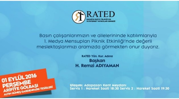 RATED 1. Medya Mensupları Piknik Etkinliği 1 Eylül Perşembe günü Arifiye Gölbaşı Altın Güneş Garden Park Tesislerinde gerçekleşiyor. Piknik organizasyonuna basın çalışanları ve aileleri katılıyor. Piknik için Adapazarı Kent Meydanından saat 18.30 ve 19.30’da servisler kaldırılacaktır. Piknik boyunca ikramlar ve çeşitli etkinlikler düzenlenecek. Ödüllü oyunlar, müzikler ve çeşitli etkinliklerle basın çalışanları ve aileleri yoğun ve stresli geçen yaz döneminin yorgunluğunu bu piknikte atacaklar.Medyayı piknikte buluşturmak istediklerini söyleyen RATED Yönetim Kurulu Başkanı Remzi Adıyaman, tüm basın çalışanları ve ailelerini pikniğe davet etti. Adıyaman, “Basın çalışanlarımızı ve ailelerini Perşembe günü organize edeceğimiz Medya Mensupları Piknik Etkinliğine davet ediyorum. Meslektaşlarımızı bu piknikte bir arada görmek bizleri mutlu edecektir” dedi.