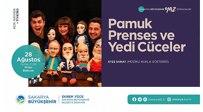Büyükşehir Belediyesi Yaz Etkinlikleri 28 Ağustos Cuma günü Millet Bahçesi’nde ‘Pamuk Prenses ve Yedi Cüceler’ adlı müzikli kukla gösterisi ile devam edecek. Saat 21.00’da başlayacak etkinliğe tüm kültür sanat dostları davet edildi. Sakarya Büyükşehir Belediyesi Kültür ve Sosyal İşler Dairesi Başkanlığı tarafından düzenlenen Yaz Etkinlikleri devam ediyor. Ateş Sanat tarafından hazırlanıp sahnelenen müzikli kukla gösterisi ‘Pamuk Prenses ve Yedi Cüceler’ oyunu 28 Ağustos Cuma günü saat 21.00’da Millet Bahçesi içerisinde bulunan Eski Açık Tribünde vatandaşlarla buluşacak. Kültür ve Sosyal İşler Dairesi Başkanlığı’ndan yapılan açıklamada, “Kültür Sanat dostlarını bir araya getirecek olan oyunumuza tüm hemşerilerimizi sosyal mesafe, maske ve hijyen kurallarına hassas davranarak eski açık tribününe davet ediyoruz” ifadelerine yer verildi.