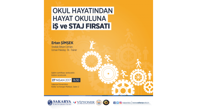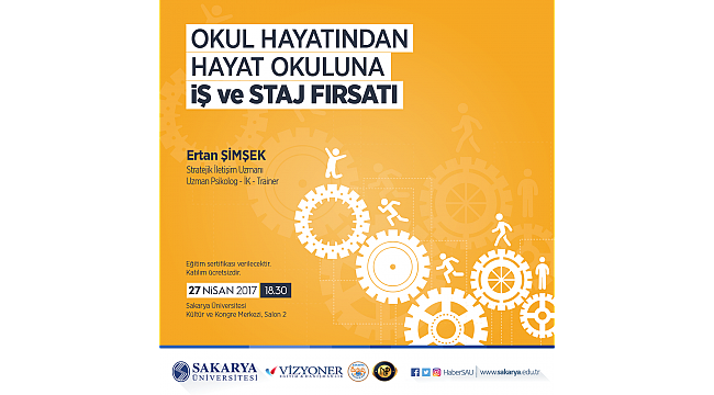 Sakarya Üniversiteli Akil Gençlik Öğrenci Topluluğu tarafından 27 Nisan Perşembe günü saat 18:30’da ‘Okul Hayatından Hayat Okuluna İş ve staj Fırsatları’ isimli bir etkinlik düzenlenecek. SAÜ Kültür ve Kongre Merkezi’nde düzenlenecek olan etkinliğe, Stratejik İletişim Uzmanı Ertan Şimşek konuşmacı olarak katılacak.