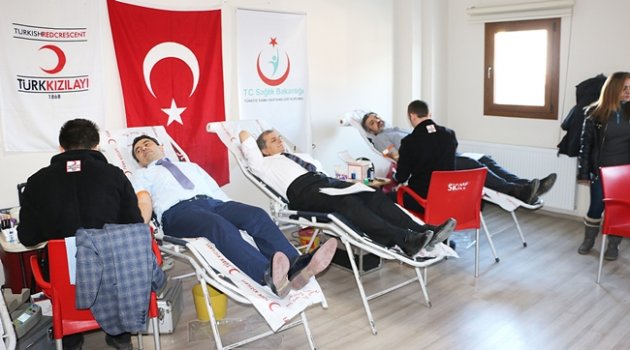 KAMU HASTANELERİ DESTEK VERDİSakarya Kamu Hastaneleri Birliği Genel Sekreterliği ile Kızılay sakarya Kan Bağışı Merkezi tarafından düzenlenen kan bağışı kampanyası kamu hastanelerinin ardından Genel Sekreterlik binasında devam etti. Genel Sekreter Doç. Dr. Hasan Salih Sağlam, Tıbbi Hizmetler Başkanı Opr. Dr. Özcan Öktem, İdari Hizmetler Başkan V. Dr. Hasan Bektaş, Mali Hizmetle Başkan V. Ahmet Kemiksizoğlu’nun destek verdiği kan bağışına personelde yoğun ilgi gösterdi. Kış aylarında soğuk algınlığı ve gribal enfeksiyonlar nedeniyle kan bağışında yaşanan azalmanın önüne geçmek için yapılan kampanyalar kapsamında kamu hastanelerinde ve devlet kurumlarında yürütülen bağış kampanyalarının önemli olduğunu dile getiren Genel Sekreter Doç. Dr. Sağlam, kan bağışının sağlık açısından da büyük önemi olduğunu ifade etti. KEMİK İLİĞİNİ GÜÇLENDİRİYORKan bağışında bulunan Sağlam, kan bağışının kemik iliği gelişimi açısından önemli olduğunu vurgulayarak “Düzenli kan bağışı vücudumuzun kan üretimi açısından öneli. Kemik iliği sürekli kan üretimi için çalışıyor ve bir nevi antrenman yapıyor. Bu durum sağlık açısından faydalıdır. Sağlıklı her yetişkinin düzenli kan bağışçısı olmasını sağlamak gerekiyor. Kan ihtiyacı sağlık tesislerimizde acil durumlarda, ameliyatlarda hayati önem taşıyor. Ülkemizde kan toplama işi Kızılay’a verilmiş. Bizde kamu hastaneleri olarak bağış konusunda her zaman elimizden gelen desteği vermeye çalışıyoruz.” diye konuştu. Genel Sekreterlik Kan Bağışı Kampanyası Koordinatörü Uz. Ömer Karayel, Kızılay Sakarya Kan Bağışı Merkezi Koordinatörü İlke Dölek ile Dr. Murat Göl, kan bağışı çalışmalarıyla ilgili bilgi Genel Sekreter Sağlam’a bilgi verdi.