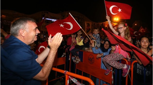 Sakarya, 15 Temmuz darbe girişimin ardından demokrasi nöbetine devam ediyor. Kalkışmanın 17’inci gününde de Demokrasi Meydanı’nda toplanan on binlerce vatandaş darbeyi lanetledi. Özgürlük, demokrasi, bayrak, vatan için sloganlar atıldı. Programda Başkan Toçoğlu’nun yanı sıra, AK Parti İl Başkanı Fevzi Kılıç, AK Parti Milletvekilleri Prof. Dr. Mustafa İsen, Ali İhsan Yavuz, belediye başkanları, ilçe başkanları, STK temsilcileri ve gazeteciler de yer aldı. Önümüz AçıkGrup Tillo’nun seslendirdiği eserlerle başlayan gecenin ilk konuşmasını yapan Başkan Toçoğlu, “Tam 17 akşam oldu. Darbecilere, devlet ve millet düşmanlarına karşı direnişimizin 17’inci akşamı. Allah sizlerden razı olsun. Misafirimiz olan çok değerli isimler Sakarya’nın bir başka olduğunu söylüyorlar. Hamdolsun direnişimiz boşa çıkmadı. Bu direniş sayesinde bir yandan darbeci katillerin elleri kırılırken; bir yandan da devletimiz yeniden yapılanıyor. Alınan kararları, yapılan işlemleri takip ediyorsunuz. İnşallah önümüz bundan sonra çok açık” diye konuştu. Direniş Zihinlerimizde SürecekBaşkan Zeki Toçoğlu, “Sayın Cumhurbaşkanımız 7 Ağustos Pazar günü çok büyük bir finalle direnişi noktalayacaklarının sinyallerini verdiler. Bizde sakarya olarak şimdiye kadar görülmemiş bir kalabalıkla ve coşkuyla direnişimizin meydanlardan ziyade zihinlerimizde devam edeceğinin sinyallerini vereceğiz. Büyük bir hazırlık içerisindeyiz. Tüm Türkiye Sakarya’yı konuşacak. Diğer yandan hiç bişey geçmiş değil. Önümüzde bir süreç var. Aynı şekilde karıncayı dahi incitmeden hukuki davamızı sürdüreceğiz. Şehitlerimize ve gazilerimize dua edeceğiz. Buralarda onlar sayesinde olduğumuzu unutmayacağız” ifadelerini kullandı. Nöbetimiz SürüyorFerizli Belediye Başkanı Ahmet Soğuk, “15 Temmuz gecesinden şu ana kadar örnek bir mücadele gösterdiniz. Ülkemiz hep darbelerle karşı karşıya kaldı. Bu darbelere hep birlikte karşı durduk. Bu ülkede inanın bizde çok zahmetler çektik. 15 Temmuz’dan itibaren Ferizli’de de vatandaşlarımız nöbetini sürdürüyor. Buradan hepsine ayrı ayrı şükranlarımı sunuyorum. İlçemizde de örnek bir mücadele örneği gösterildi. İnşallah son ana kadar da sürecek” diye konuştu. 15 Temmuz’da Sizleri Yok Saydılarİstiklal Marşı’nın 10 kıtasını okuyan Tuana Demir’in ardından konuşan AK Parti İl Başkanı Fevzi Kılıç, “15 Temmuz’da sizleri yok saydılar. Ancak içinizden Çanakkale Ruhu çıktı. Sakarya Ruhu çıktı. Tarihin derinliklerine bunu işlediniz. 17 gündür buıradasınız. Arkasında kadınlar ve gençler olmayan söylem başarılı olamaz. Bu anlamda kadınlarımızı ve gençlerimizi ayrı ayrı tebrik ediyorum. Kardeşlerim birileri ülkeyi imar etmeye çalışırken birileri ifşad etmeye çalışıyor. Bu memlekette kan, gözyaşı ve acı olsun diye uğraşıyorlar” dedi. Milli Mücadele Örneği GösterdinizAK Parti Milletvekili Ali İhsan Yavuz, “Her akşam bu meydanı böyle güzel doldurduğunuz için sizleri tebrik ediyorum. Gerçekten bir milli mücadele örneği sergilediniz. Ancak bunu dünya görmüyor. Görmemek bir yana başta Cumhurbaşkanımız olmak üzere bu millete düşmanlık yapmayı sürdürüyorlar. Sizce neden? Çünkü sizler oyunu çözdünüz, kurulan tezgahı fark ettiğiniz için. Bizleri korkutmak istiyorlar. Başta Cumhurbaşkanımızı çünkü hedef o” diye konuştu. Gönül Coğrafyamızda Nöbet VarAK Parti Milletvekili Prof. Dr. Mustafa İsen, “Bugün kutsal nöbetinizin 17’inci gecesi. Durmadan, usanmadan ve bıkmadan bu meydanları dolduruyorsunuz. Üstelik sadece Sakarya’da değil, ülkemizde, gönül coğrafyamızda aynı nöbet devam ediyor. Bunu bir tek şey için yapıyoruz: Irzınıza, namusunuza tasallut eden elleri kırmak için. Üstelikte bu işi 17 gündür etrafımıza zarar vermeden yaptık. Bu olgunluk, vakar ve sabır için hepinize binlerce kez teşekkür ediyorum” ifadelerini kullandı.