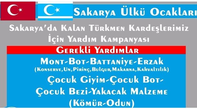 Sakarya Ülkü Ocakları İl Başkanı Sayın Serdar Gül, Karasu’da bulunan Irak Türkmeni aileler için başlatılan yardım kampanyasına yediden yetmişe herkesin destek vermesi gerektiğini söyledi.IŞİD zulmünden kaçan Türkmenlerin yaralarını sarmak için toplanacak yardımların Mersin'e gönderileceğini aktaran Gül "IŞİD teröründen kaçarak, evlerini yurtlarını arkalarında bırakan Türkmen kardeşlerimizin her zaman yanlarında olmaya çalıştık. Düzenlenen kampanyalarda her zaman sivil toplum kuruluşları arkamızda oldu. Fakat bu yardımlar bir günlük değil, sürekli ihtiyaç" dedi.Karasu ‘ da 100'e yakın Türkmen ailesinin olduğunu anımsatan Gül ,şöyle konuştu: "Türkiye'ye 1930'lu yıllardan beri başlayan Irak Türkmen göçü son yıllarda bilindiği üzere IŞİD terörü yüzünden arttı. Son yıllarda gelen ailelerle birlikte ülkemizde 35 bin civarında Türkmen olduğu tahmin edilmekte. Ocağımızın bünyesinde başlatılan yardımlarla imkanlar ölçüsünde Türkmen kardeşlerimize yardım ediyoruz. Yardımsever Vatandaşlar Cep Telefonundan 5 TL Karşılığında Yardım Kolileri Halinde Gerçekleşen Kampanyaya TÜRKMENDAĞI yazıp 1079'a Mesaj Göndererek Yardım Yapılabilecek.Başlatılan Kampanya Çerçevesinde Ayni Yardım Olarak: Gıda Grubu: Su, Konserve, Bulgur, Pirinç, Makarna, Un, Kahvaltılık , Çocuk MamasıTekstil Grubu: Çocuk Bezi, Ayakkabısı, Giyim, BattaniyeYakacak Grubu : Kömür , OdunYardım yapacak vatandaşlarımız İl ve İlçe Ülkü Ocakları Eğitim ve Kültür Vakfı temsilciliklerine ulaştırabilirler. Sakarya merkezde yardımları ulaştırmak için irtibat adresi: Karaağaçdibi Caddesi M. Baldan İşhanı Kat: 4 (Bilge Hastanesi Karşısı) İrtibat telefonları : 0537 656 62 40 / 0537 709 27 73