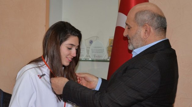 Başkan Püsküllü, Türkiye Şampiyonu Rümeysa Akyüzlü’yü altınla ödüllendirdi.