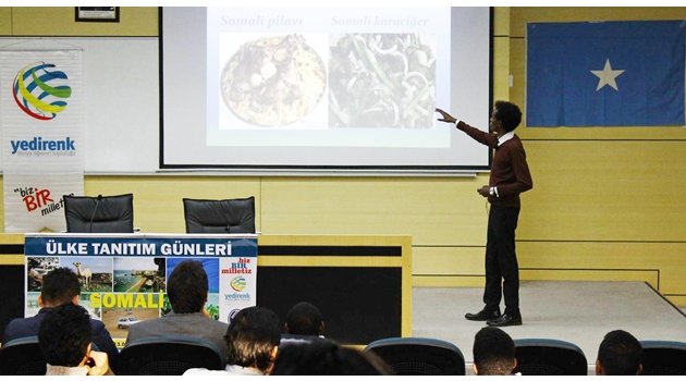 SAÜ Kültür ve Kongre Merkezi’nde gerçekleştirilen etkinlikte, Sakarya Üniversitesi’nde okuyan Somalili öğrenciler ülkelerini anlattı. Etkinliğin açılış konuşmasını Yedirenk Dünya Öğrenci Topluluğu Akademik Başkanı Yrd. Doç. Dr. Yaşar Kahraman yaptı.Yedirenk Dünya Öğrenci Topluluğu olarak uluslararası öğrencileri temsil ettiklerini belirten Yrd. Doç. Dr. Yaşar Kahraman, “Allah sizleri bir erkek bir kadından ve kabile olarak yarattı ki birbirinizle tanışın. Yedirenk, birbirinizle tanışmanın en güzel örneklerinden biridir. Etkinlik, Sakarya’ya okumak için gelen Somalili öğrencilere, kendi ülkelerini tanıtma fırsatı vermek amacıyla düzenlendi” dedi.Kahraman’ın konuşmasının ardından sempatik tavırları ve akıcı Türkçesi ile dikkat çeken Somalili öğrenci Abdelnor Dahir, Somali tarihi, kültürü, gelenekleri, yemek ve kıyafetleri üzerine bir sunum yaptı.Katılımcıların büyük bir ilgi ve coşkuyla takip ettiği etkinlikte Somalili öğrencilerin, ülkelerini ve kültürünü tanıtmak amacıyla kurdukları stant büyük ilgi gördü. Sunumun ardından Abdelnor Dahir katılımcıların sorularını yanıtladı.Etkinliğin sonunda, SAÜ Sosyal Bilimler Enstitüsü Müdürü Prof. Dr. Fatih Savaşantarafından Somalili öğrenci Abdelnor Dahir’e plaket takdim edildi.