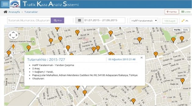 Doğu Marmara Kalkınma Ajansı tarafından desteklenen proje, İstanbul Büyükşehir Belediyesi’nin öncülüğünde gerçekleşen Transist 2016 İstanbul Ulaşım Kongresi ve Fuarının proje yarışmasında, verimlilik dalında ikincilik ödülü aldı. Daha önce el ile oluşturulan trafik kaza tutanakları, proje ile bundan sonra kaza yerinde bulunan ekiplerce dizüstü bilgisayar veya tabletlerle doğrudan sisteme girilecek ve bilgi bankası oluşturulacak. Trafik kaza verilerinin elektronik ortama aktarılması ile kazaların görsel olarak haritalandırılması, istatistiki yöntemlerle ve iş zekâsı teknikleri ile esnek raporlanması sağlanacak. Bu sayede trafik kazalarının nedenleri belirlenerek, önleyici tedbirler alınmasına imkân sağlanacak. Sakarya Üniversitesi İşletme Fakültesi Yönetim Bilişim Sistemleri Bölüm Başkanı Prof. Dr. Erman Coşkun tarafından yürütülen projede, İşletme Fakültesi öğretim üyesi Yrd. Doç. Dr. Kamil Taşkın, İşletme Fakültesi öğretim elemanı Arş. Gör. Hüseyin Serdar Geçer ve Bilgi İşlem Dairesi Başkanlığı'ndan Uzman Semih Bitim de görev aldı.