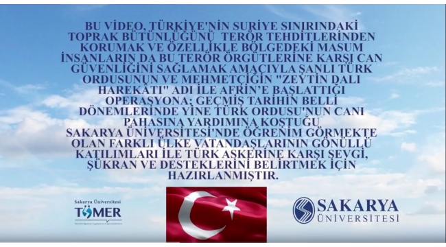 SAÜ TÖMER bünyesinde Türkçe hazırlık alan ve sakarya Üniversitesi’nin farklı bölümlerinde öğrenim görmekte olan uluslararası öğrencilerden Afrin harekatına katılan Türk ordusuna ithafen duygularını belirten sevgi ve dua içerikli Türkçe destek mesajlarından oluşan bir klip hazırlandı.Türkiye’nin toprak bütünlüğü için tehlike oluşturan terör örgütlerini bölgeden çıkarmak ve bölge vatandaşları için de güvenli bir şekilde yaşanabilecek hale getirmek için Türkiye’nin Suriye sınırındaki Afrin’e 20 Ocak’ta “Zeytin Dalı Harekâtı” başlatan TSK, tüm ülkede de destek görürken, dünyadaki farklı ülkelerden de destek aldı. Halen devam harekatta bin 500’ün üzerinde terör örgütü mensubu etkisiz hale getirilirken, Türk ordusu da birçok şehit verdi.Türk Ordusu’nun tarihin belli dönemlerinde destek, huzur ve güven tesis etmek için operasyonlarda bulunduğu ülkeleri temsilen Sakarya Üniversitesi’nde öğrenim görmekte olan uluslararası öğrenciler de Türk askerine teşekkür niteliğinde 14 Şubat gibi anlamlı bir günde sevgi, şükran ve dua içerikli destek mesajlarını Türkçe olarak belirten bir video hazırladılar.Videoda Suriye, Irak, Azerbaycan, Yemen, Bosna Hersek, Filistin, Endonezya, Cezayir, Sudan gibi ülkelerden öğrenciler sevgi, şükran ve “Allah yardımcınız olsun, Gazanız mübarek olsun, Sağ salim tezden dönesiniz, Allah sevdiklerinize kavuştursun, Ayağınıza taş değmesin, Zaferiniz daim olsun” gibi dua mesajlarını Türkçe olarak Mehmetçik’e gönderdiler.Söz konusu video “https://youtu.be/G9yR1t9cAuA” adresinden izlenebiliyor.