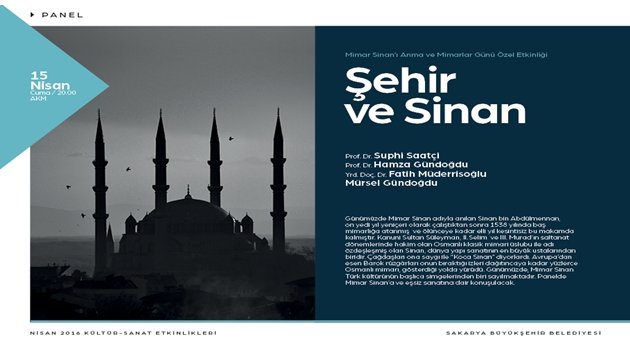 Sakarya Büyükşehir Belediyesi Kültür ve Sosyal İşler Dairesi Başkanlığı Nisan Kültür Sanat Etkinlikleri ‘Şehir ve Sinan’ paneli ile devam edecek. Yapılan açıklamada; “Nisan Kültür Sanat Etkinlikleri kapsamında 15 Nisan Cuma günü ‘Şehir ve Sinan’ paneli gerçekleştirilecektir. Adapazarı Kültür Merkezi’nde (AKM) saat 20.00’de başlayacak programa Prof. Dr. Suphi Saatçi, Prof. Dr. Hamza Gündoğdu, Yrd. Doç. Dr. Fatih Müderrisoğlu ve Mürsel Gündoğdu konuşmacı olarak katılacaktır. Programa tüm kültür sanat dostları davetlidir” denildi.