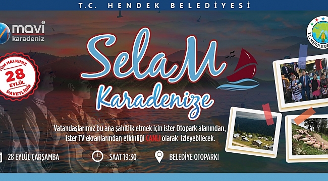 Hendek’te 28 Eylül akşamı Karadeniz rüzgarı esecek. Mavi Karadeniz Tv’de yayınlanan Selam Karadeniz’e adlı program Hendek Belediyesinin destekleriyle 28 Eylül Çarşamba akşamı Hendek Belediyesi Otopark alanından canlı yayınla seyirci ile buluşacak. Hendek Belediye Başkanı Turgut Babaoğlu herkesi ekran başına, yayını canlı olarak izlemek isteyenleri ise otopark alanına davet etti.