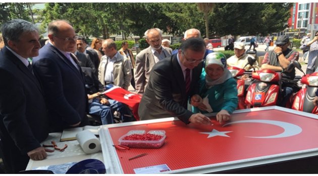 Programda Paralimpik Spor Klübü Başkanı Selim Özen’in konuşması’nın ardından başta Sakarya Vali Yardımcısı Bekir Dınkırcı mozaik taşını koyarak Türk Bayrağını oluşturmaya başladı. Ardından protokol de tek taş koydu. Protokol daha sonra sergiyi gezdi. Öte yandan engelli bireyler mozaik taşlarından tamamlanan Türk Bayrağını Cumhurbaşkanı Recep Tayyip Erdoğan’a göndereceklerini belirtti.