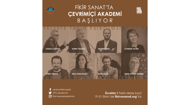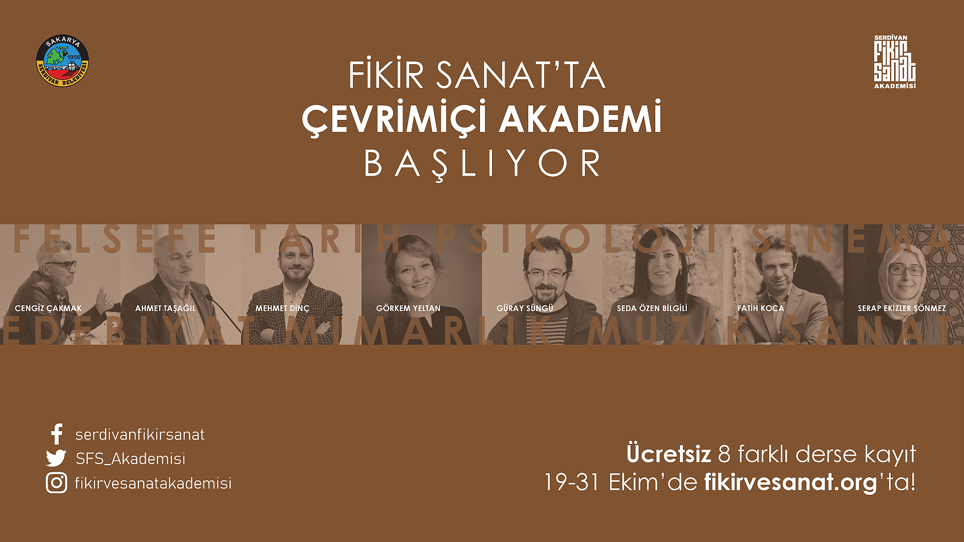 Mart ayında, Türkiye genelinde yüz yüze eğitimlere ara verilmesi ile birlikte, akademik programlarına kısa bir mola veren Serdivan Fikir ve Sanat Akademisi, alanlarında önemli isimleri güz dönemi derslerinde çevirim içi olarak öğrencilerle buluşturuyor. Felsefe, Tarih, Psikoloji, Sinema, Edebiyat, Mimarlık, Müzik, Sanat disiplinlerinin yer aldığı 8 farklı dersten oluşan güz dönemi programına dünyanın her yerinden çevrim içi katılmak mümkün olacak. Ders başvurularının online olarak alındığı programların içeriğine ise www.fikirvesanat.org adresinden ve Serdivan Fikir ve Sanat Akademisi’nin sosyal medya hesaplarından ulaşmak mümkün. Ücretsiz olarak erişilebilecek derslere son başvuru 31 Ekim Cumartesi.