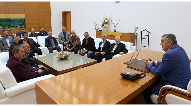 Sakarya Büyükşehir Belediye Başkanı Zeki Toçoğlu, Serdivan Muhtarlar Derneği Başkanı Adem Bayraktar ve beraberindeki muhtarları makamında ağırladı. Gerçekleştirilen ziyarette söz alan Bayraktar, “Serdivan, Büyükşehir Belediyesi ve ilçe belediyemizin yatırımlarıyla gelişmeye devam ediyor. Kampüs Yolu ve Bağlar Caddesi’nde başlatılan çalışmalardan oldukça memnunuz. Büyükşehir Belediyesi’nin tüm birimleri ile işbirliğimiz devam edecek” diye konuştu.İyi Bir Diyalog YakaladıkBaşkan Toçoğlu, “1 Kasım seçimleri öncesinde 16 ilçemizdeki muhtarlarımızla bir araya geldik. Muhtarlarımızla iyi bir diyalog yakaladık. Gelen talepleri Büyükşehir bürokratlarımız tek tek not aldılar. Hızlı çözümler ürettik, üretmeye devam ediyoruz. Büyükşehir Belediyesi olarak muhtarlarımızın talepleri doğrultusunda çalışmalarımıza devam edeceğiz. Muhtarlarımız 1 Kasım seçimlerinde ülkemizin istikrara kavuşmasını adına önemli destek verdiler. İnşallah biz de bu güveni boşa çıkarmayacağız” ifadelerini kullandı.Sağlıklı ve Temiz İçmesuyuBaşkan zeki toçoğlu konuşmasını şu şekilde sürdürdü; “Büyükşehir Belediyesi olarak şehrimizin içmesuyu ağını genişletmek adına önemli yatırımları hayata geçirdik. İlçemize kazandırdığımız yeni bulvar ve caddelerimizde de altyapı çalışmalarımızı tamamladık. Bu kapsamda Serdivan’da 13 mahalleyi ilgilendiren Esentepe İçmesuyu Projesi'nde hat döşeme çalışmalarımızı sonlandırdık. Yaklaşık 2,5 milyonluk yatırım ile Serdivan'ın yüksek kesimlerindeki 13 mahallenin su soruna kesin çözüm getirdik.”Yeni Bulvar“Büyükşehir Belediyesi olarak Serdivan’ın gelişmesi ve kalkınması adına önemli hizmetleri hayata geçirmeye devam ediyoruz. Kampüs Yolu ve 7. Cadde’de yol genişletme çalışmalarımız tamamlandı. Fen İşleri ekiplerimiz asfalt çalışmalarına başladı. İnşallah kısa süre içerisinde asfalt çalışmaları tamamlanarak, Serdivan’a yeni bir bulvar kazandırmış olacağız. Ayrıca Kafeler Caddesi olarak bilinen Bağlar Caddesi’nde de başlatmış olduğumuz çalışmalar aralıksız sürüyor. Buradaki çalışmaların tamamlanmasıyla cadde yeni bir yüz kazanmış olacak. Şehrimizin tamamının ihtiyaçlarını biliyor, bu yönde adımlar atmayı sürdürüyoruz. Serdivan; yeni bulvarı, duble yolları, altyapı ve içmesuyu projeleri ile gelişmeye devam edecek.”
