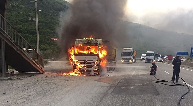 Alınan bilgilere göre, D-650 Karayolunun geyve Adapazarı istikameti Dereköy mevkiinde meydana gelen olayda seyir halinde olan sürücüsünün ismi belirlenemeyen 34/PSK/.. plakalı hafriyat tır’ından bir anda dumanlar çıkmaya başladı. Bunu fark eden tır sürücüsü aracı Geyve Dereköy üst geçiti cıvarında Hafriyat kamyonunu yolun sağına çekerek aşağıya indi.Elektrik tesisatından çıktığı tahmin edilen yangını tır ile çevrede bulunan araç sürücüleri itfaiye’ye haber verdi.Yangın anında trafik çift taraflı olarak durduruldu.Olay yerine gelen Geyve İtfaiyesi ekiplerinin müdahalesiyle tır yangını kontrol altına alınarak söndürüldü. Ancak yanan tır’ın ön çekici kısmı tamamen kullanılamaz hale geldi.Olayla ilgili soruşturma sürdürülmektedir.