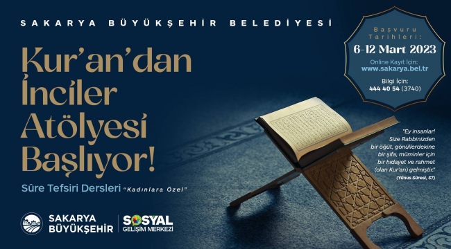 Sakarya Büyükşehir Belediyesi Sosyal Hizmetler Dairesi Başkanlığı bünyesinde faaliyet gösteren sosyal gelişim merkezi’nde ‘kur’an’dan İnciler atölyesi’ başlıyor. Ramazan ayına yaklaşırken insanla Kur’an-ı Kerimi buluşturma, Kur’an-ı Kerim’i okuma, anlama ve hayat tarzı haline getirme amacıyla tasarlanan atölye kadınlara yönelik düzenlendi. 12 Mart tarihine kadar online olarak kayıt olunabilecek atölyede ilk ders zili 13 Mart Pazartesi günü çalacak. Atölyenin eğitim programı her pazartesi 10.00-12.00 ve her Perşembe günü saat 14.00-16.00 olarak iki farklı grup olarak planlandı. Online olarak www.sakarya.bel.tr adresinden kayıt olunabilecek. Detaylı bilgi isteyenler ise 444 40 54 (3740) numaralı telefon üzerinden ulaşabilecek.