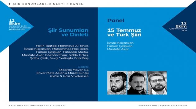 Sakarya Büyükşehir Belediyesi Ekim Kültür Sanat Etkinlikleri kapsamında düzenlenen 16. Uluslararası Sapanca Şiir Akşamları, 12 Ekim Çarşamba günü iki programla devam edecek. İlk olarak saat 14.00’da Sakarya Üniversitesi Helikopter Pistinde gerçekleştirilecek programda Şairler Melih Tuğtağ, Mahmoud Al Taweel, İsmail Kılıçarslan, Muhammed Hac Bekri, Furkan Çalışkan, Fahreddin Shehu, Mustafa Akar, Gökhan Ergür, Sıddık Ertaş, Şafak Çelik, Sevgi Yerlioğlu ve Fazıl Baş şiirlerini katılımcıların beğenisine sunacak. Ardından Ricardo Moyano, Enver Mete Aslan ve Murat Süngü dinletilerle öğrencilere doyumsuz bir gün yaşatacak. 15 Temmuz’a Şiirsel BakışGünün ikinci programında ise saat 19.00’da ’15 Temmuz ve Türk Şiiri’ konulu panel gerçekleştirilecek. AKM’de düzenlenecek panele İsmail Kılıçarslan, Furkan Çalışkan ve Mustafa Akar konuşmacı olarak katılacak. Konuyla ilgili yapılan açıklamada; “16. Uluslararası Sapanca Şiir Akşamları’nda 12 Ekim Çarşamba günü iki etkinlik Sakaryalılar ile buluşacak. Sakarya Üniversitesi Helikopter Pistinde ve AKM’de gerçekleştireceğimiz programlarımıza tüm kültür sanat dostları davetlidir” denildi.