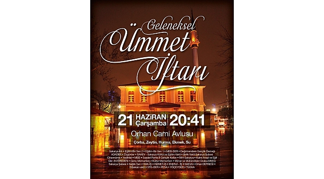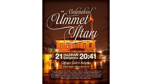 Ümmet İftarı menüsünde Çorba, Ekmek, Hurma, Zeytin ve su dağıtılacak.Sivil Toplum Kuruluşları tarafından yapılan açıklamada Sakaryalı tüm hemşehrilerimizi iftarımıza davet ediyoruz dendi.Ümmet İftarı organize eden Sivil Toplum Kuruluşları ;Sakarya İhh