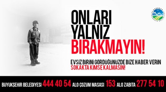 Sakarya Büyükşehir Belediyesi sokakta kalan kimsesiz ve ihtiyaç sahibi vatandaşlara ulaşmaya devam ediyor. Konuyla ilgili açıklamalarda bulunan Sosyal Hizmetler Dairesi Başkanı Davut Yüce, “Soğuk havalar etkisini hissettirmeye başladığı andan itibaren ekiplerimiz sahada aktif olarak tespitlerini sürdürüyor. Kimsesizlerin kimi olmaya devam ediyoruz, edeceğiz” ifadelerini kullandı. Sokakta kimse kalmasınYüce, “Şehir genelinde yürüttüğümüz çalışmalar neticesinde sokakta kalan kimsesiz ve ihtiyaç sahibi vatandaşlarımızın sağlık, barınma, gıda gibi birincil ihtiyaçlarını karşılıyoruz. Tabi bazı zamanlar ulaşamadığımız ihtiyaç sahipleri oluyor. Bu konuda hemşerilerimizden duyarlılık bekliyoruz. Vatandaşlarımız da Büyükşehir Belediyesi 444 40 54, ALO 153 Çözüm Masası ve ALO Zabıta 277 54 10 telefon numaralarını arayabilir; kimsesiz ve sokakta yaşamak durumunda olan vatandaşlarımızı tarafımıza bildirebilirler” diye konuştu.