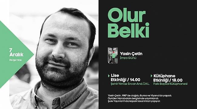 Sakarya Büyükşehir Belediyesi Aralık Kültür Sanat Etkinlikleri Yazar Yasin Çetin’in katılacağı ‘Olur Belki’ konulu söyleşi ve imza günü programlarıyla devam edecek. Bu kapsamda 7 Aralık Perşembe günü ilk olarak saat 14.00’da Şehit Yılmaz Ercan Anadolu İmam Hatip Lisesi’nde öğrencilerle bir araya gelecek olan Çetin, günün bir diğer etkinliğinde ise saat 18.00’da Faik Baysal Kütüphanesi’nde Sakaryalı kültür sanat dostlarıyla buluşacak. Kültür ve Sosyal İşler Dairesi Başkanlığından yapılan açıklamada, “Tüm kültür sanat dostlarını programlarımıza bekliyoruz” denildi.