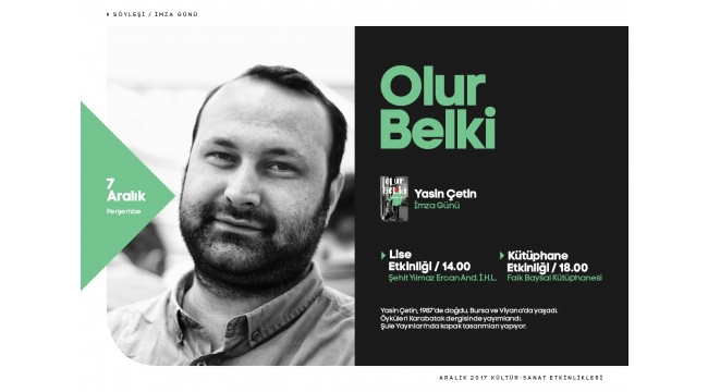 Büyükşehir Kültür Sanat Etkinlikleri 7 Aralık Perşembe günü Yazar Yasin Çetin’in katılacağı ‘Olur Belki’ konulu söyleşi ve imza günü programları ile devam edecek.