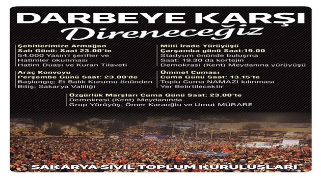 Sakarya Sivil Toplum Kuruluşları, hezimete uğrayan darbe girişimine karşı Demokrasi Meydanı’nı direnişin merkezi haline getirecek faaliyetlere imza atacak. STK’ların ortaklaşa yaptığı bildiride teyakkuz içerisinde direnişin süreceği kaydedilirken, 20 Temmuz Çarşamba günü geniş katılımlı bir yürüyüş gerçekleştirileceği duyuruldu.