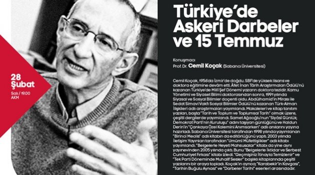 Sakarya Büyükşehir Belediyesi Kültür ve Sosyal İşler Dairesi Başkanlığı tarafından düzenlenen Şubat Kültür Sanat Etkinlikleri ‘Türkiye’de Askeri Darbeler ve 15 Temmuz’ konulu konferans ile sona erecek. 28 Şubat Salı günü saat 19.00’da Adapazarı Kültür Merkezi’nde gerçekleştirilecek programa Prof. Dr. Cemil Koçak konuşmacı olarak katılacak. Büyükşehir Belediyesi’nden yapılan açıklamada, saat 19.00’da başlayacak programa tüm kültür sanat dostları davet edildi.