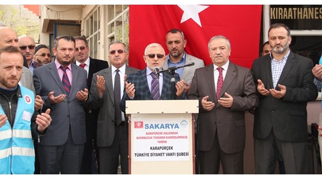Diyanet İşleri Başkanlığı ve Türkiye Diyanet Vakfı tarafından, Bayırbucak Türkmenlerine yönelik başlatılan ‘Şimdi Yaraları Sarma Zamanı’ kampanyası kapsamında toplanan yardımlar, Sakarya Müftüsü İlyas Serenli’nin katıldığı törenle bölgeye gönderildi.Bayırbucak Türkmenlerine ulaştırılmak üzere gönderilen yardımların uğurlanmasında konuşan Sakarya Müftüsü İlyas Serenli, kampanyaya yardımlarıyla destek veren hayırsever Karapürçeklilere teşekkür ederek, bu anlamlı organizasyona öncülük eden Karapürçek Müftüsü Şaban Soytekinoğlu ve ilçe din görevlilerini özverili çalışmaları dolayısıyla tebrik etti.Bayırbucak Türkmenleri için hazırlanan yardım tırları İl Müftü Yardımcısı Yusuf Akkuş’un yaptırdığı dua ile uğurlandı. Yardım Tırlarındaki gıda ve ihtiyaç maddelerini bölgede bizzat yerinde birinci elden dağıtmak üzere, Karapürçek Zincirli Ali Paşa Camii İ-H. Erol Demir başkanlığındaki TDV Karapürçek Gönüllü Ekibi de bölgeye intikal etmek üzere yola çıktı.