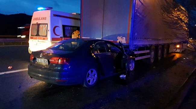 Sakarya-Düzce il sınırında otomobilin tır dorsesinin altına girmesi sonucu TEM Otoyolunda meydana gelen trafik kazasında 1’i ağır toplam 3 kişi yaralandı. Kazada tır dorsesinin altına giren otomobil, yaklaşık 80 metre boyunca sürüklendi.