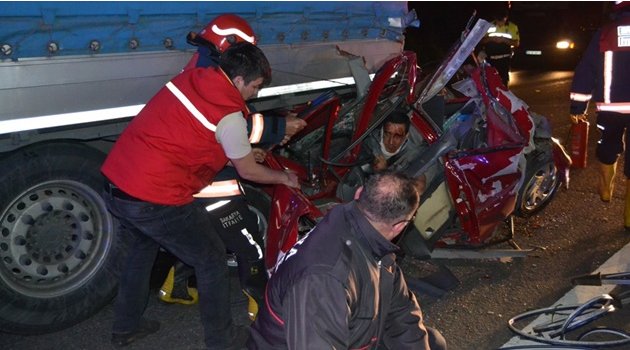 Edinilen bilgiye göre kaza saat 02.00 sıralarında meydana geldi. İstanbul’dan Ankara istikametine ilerleyen Süleyman C. (39) idaresindeki 47 PU 658 plakalı TIR, TEM Otoyolu Arifiye mevkiinde, iddiaya göre önünde seyreden ve yolda meydana gelen kısa süreli trafik sıkışıklığı nedeniyle yavaşlayan Emre A. (32) idaresindeki 54 E 2812 plakalı otomobile çarptı. Çarpmanın etkisiyle savrulan otomobil de önünde ilerleyen Sezer K. idaresindeki 26 SK 887 plakalı boya yüklü TIR’ın altına girdi. TIR’la birlikte bir süre sürüklenen otomobilde sürücü Emre A. ve yanında bulunan babası Orhan A. (47) sıkıştı. Olay yerine gelen Sakarya Büyükşehir Belediyesi Kaza Kırım Ekipleri, önce sürücü Emre A.’yı, sonra da babası Orhan A.’yı otomobilden çıkardı. Sağlık ekiplerinin yaptığı kontrolde, Orhan A.’nın olay yerinde hayatını kaybettiği belirlendi. Yaralı sürücü Emre A. ise bir süre ambulansa binmeyip babasının, sıkıştığı otomobilden çıkarılmasını izledi. Kazanın şokunu atlatamayan Emre A., ambulansta yapılan ilk müdahalesinin ardından Toyota Hastanesi’ne kaldırılarak tedavi altına alındı. Her iki TIR sürücüsü de ifadeleri alınmak üzere polis merkezine götürülürken, kazayla ilgili soruşturma başlatıldı.