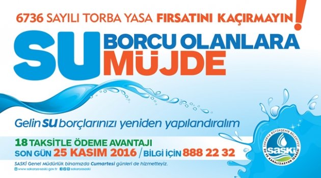 Sakarya Büyükşehir Belediye Su ve Kanalizasyon İdaresi tarafından yapılan açıklamada, su borcu olanlara taksitlendirme imkanı ve faiz indirimi sunan 6736 sayılı Torba Yasa kapsamında başvuruların devam ettiği ifade edilerek, “Borçlu vatandaşlara borçlarını yapılandırma fırsatı verilen yasada süre uzatıldı. Yasa kapsamında borçlu vatandaşların ödeme vadesi 30 Haziran 2016 tarihi ve öncesinde birikmiş borçları yeniden yapılandırıyor. Faizler silinerek borçlar tekrar hesaplanıyor. Yasa ayrıca borcu olan vatandaşlara, borçlarını 2 ayda bir ödemek üzere 18 aya kadar taksitlendirme kolaylığı da sağlıyor. Torba Yasa’nın avantajlarından faydalanmak isteyen borçlu abonelerimizin 25 Kasım Cuma gününe kadar kurumumuza gelerek başvuruda bulunması gerekiyor. Vatandaşlarımız (0264) 888 22 32 nolu telefonu arayarak konu ile ilgili ayrıntılı bilgi alabilirler” denildi.