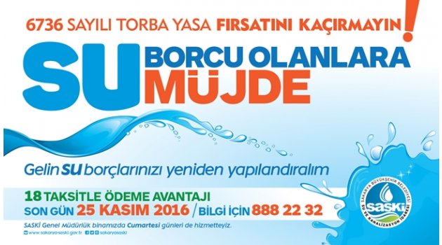Su borcu olanlara faiz indirimi ve taksitlendirme imkanı sunan 6736 sayılı Torba Yasa kapsamında başvuruların devam ettiğini belirten SASKİ Genel Müdür Yardımcısı Sebahattin Belik, “Avantajlardan yararlanmak için son başvuru tarihi 25 Kasım’dır” dedi.