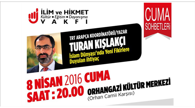 İlim ve Hikmet Vakfı Cuma Sohbetleri’ne bu hafta TRT Arapça Koordinatörü ve Yazar Turan Kışlakçı konuk olacak. 8 Nisan Cuma günü Orhangazi Kültür Merkezi’nde gerçekleştirilecek program saat 20.00’da başlayacak.