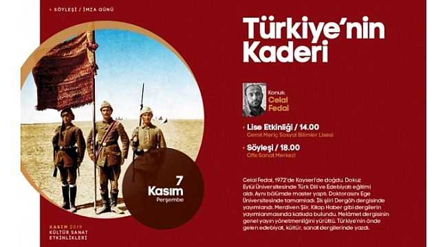 Büyükşehir Kültür Sanat Etkinlikleri, 7 Kasım Perşembe günü gerçekleştirilecek ‘Türkiye’nin Kaderi’ kitabının söyleşi ve imza günü programı ile devam edecek.
