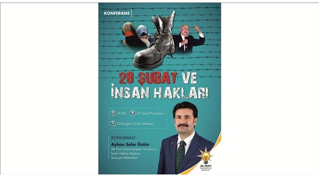 AK Parti Adapazarı İlçe Başkanlığı "28 Şubat ve İnsan Hakları" Konulu Konferansını Orhangazi Kültür Merkezi’nde 29 Şubat Pazartesi günü saat 18.00’da gerçekleştirecek. 28 Şubat Süreciyle ilgili yaşananları ak parti İnsan Haklarından Sorumlu Genel Başkan Yardımcısı Sakarya Milletvekili Ayhan Sefer Üstün programa katılanlara anlatacak.29 Şubat Pazartesi günü 18.00’da gerçekleştirilecek olan programa tüm vatandaşlarımızın davetli olduğu belirtildi.