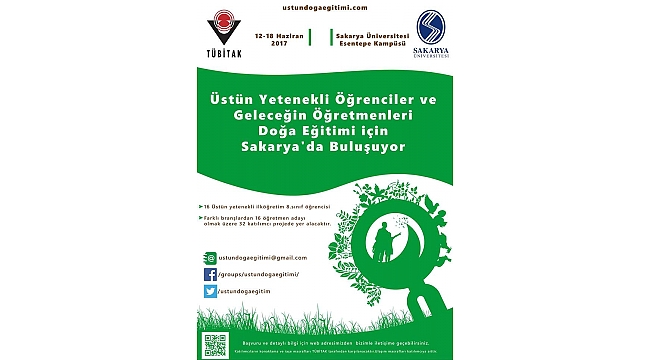 TÜBİTAK "4004- Doğa Eğitimi ve Bilim Okulları Destekleme Programı" kapsamında 2016 yılı 1. döneminde Türkiye genelinde yapılan 307 başvuru arasından desteklenmesine karar verilen 28 projeden birisi olan “Üstün Yetenekliler ve Geleceğin Öğretmenleri Doğa Eğitimi için Sakarya’da Buluşuyor” başlıklı proje 12-18 Haziran 2017 tarihleri arasında sakarya Üniversitesi ev sahipliğinde gerçekleştirilecek. Yürütücülüğünü SAÜ Eğitim Fakültesi Özel Eğitim Bölümü öğretim üyelerinden Yrd. Doç. Dr. Eda Demirhan’ın yaptığı projede farklı illerden gelen 16 üstün yetenekli ilköğretim öğrencisi ile farklı üniversite ve bölümlerde öğrenim gören 16 öğretmen adayı bir araya gelerek Sakarya’nın doğal güzelliklerini disiplinler arası bakış açısı ile incelenecek.