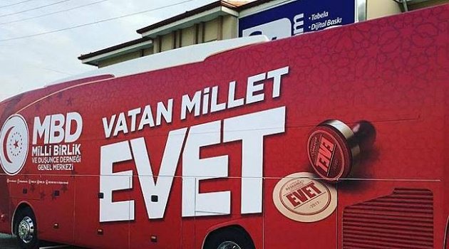 Kampanyaya Salon programları,mahalle ve kahve programlarıyla başlayan Milli Birlik ve Düşünce Derneği (MBD) Genel Merkezi; Programlarına özel tasarlanmış otobüsleriyle gidiyorlar. Şehir şehir özel tasarlanmış otobüsleriyle gidecek olan Milli Birlik ve Düşünce Derneği (MBD) Kapı kapı dolaşıp neden "EVET" diyoruzuanlatacak.Kampanya hakkında açıklama yapan mbd Genel Başkanı Erdem Ercan; 17 teşkilatlarımızda aynı anda "Vatan Millet Evet" kampanyamıza start vermiş bulunmaktayız.Özel tasarlanmış otobüsler,hazırladığımız broşürler ve promosyon çalışmalarımızla, Yeni Anayasamızı anlatıyoruz.Referandumun bir siyasi seçim olmadığı belirten başkan Ercan; bu mesele vatan meselesidir.Başkomutan Cumhurbaşkanımız Sn.Recep Tayyip Erdoğan'ın ifade ettiği gibi 2023 Hedeflerimizi gerçekleştirmekten kimse bizi alıkoyamayacaktır. Bizler de Türk Milliyetçileri olarak yılmadan,usanmadan bugün değil,her daim Vatanımız için,Milletimiz için çalışacağız."dedi.