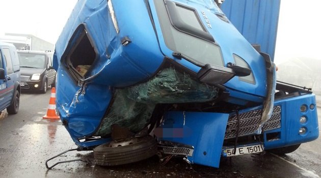 Sakarya’da sabah saatlerinde yoğun sisten dolayı önünü göremediği iddia edilen TIR şoförü kırmızı ışıkta bekleyen kamyonete arkadan çarptı.