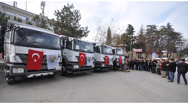 Geyve Belediyesince , altyapı çalışmalarında kullanmak üzere satın alınan 4 adet yeni iş kamyonları törenle hizmete girdi. Yeni kamyonların makine parkına eklenmesi nedeniyle geyve Belediye Başkanı Murat kaya’nın da katılımıyla Belediye önünde yapılan törende dua edilip kurban kesildi.GEYVE BELEDİYESİNDE İKİNCİ BAHARBu yılın başında alınan araçlar ve iş makinaları ile makine parkını güçlendiren Geyve Belediyesi son alınan iş kamyonlarıyla adeta ikinci baharını yaşıyor. Geçmişte işçisine, alacağına borcunu ödeyemeyen belediyeden bugün zengin makine parkına ulaşan bir Geyve Belediyesinin bulunduğunu ifade eden Başkan Kaya, alınan bu araçlar ile alt yapısı tamamlanan Geyve’nin yeni projelerinde ki çalışmaların daha da hızlanacağı belirtildi.GEYVE İÇİN ÖNEMLİ BİR HİZMETYeni araçların Geyve’ye hayırlı olmasını dileyen Başkan Murat Kaya ‘Güçlü ve kalıcı hizmetler yapabilmek için sahip olduğunuz araçların sağlam, düzgün ve çağın teknolojileri ile donatılması gerekir. Biz de bunun gereğini yapıyoruz.Geçen dönem aldığımız iş makinaları ve diğer binek araçlarımızdan sonra şimdi 4 yeni kamyon ile makine parkımızı güçlendirmemiz Geyve için önemli bir hizmettir” ifadesini kullandı.YÜRÜYEN DEĞİL, KOŞAN BİR BELEDİYEYİZGeyve Belediyesinin hizmette yürüyen değil koşan bir belediye olmaya devam ettiğini ifade eden Belediye Başkanı Murat Kaya, Gün geçmiyor ki hizmetlerimize yeni hizmet halkaları ekleyecek bir bir projeyi hayata geçirmemiş olalım. Yeni hizmetler, yeni yollar, asfaltlar, parklar bu araçlarla birlikte daha çok halkımızla buluşacak.Yeni araçlarımız ile güçlendirdiğimiz makine parkımız sayesinde Geyve’yi istikbale hazırlama noktasında, hızla yürüme değil de, koşma noktasında bu hizmetleri vatandaşlarımızla tanıştıracağız, dediHALKA DAHA İYİ HİZMETHizmetleri hızlı, etkin ve kaliteli bir şekilde yerine getirebilmek için araç ve makine parkını güçlendirmeye devam edeceklerini belirten Geyve Belediye Başkanı Murat Kaya,” Halka daha iyi hizmet amacıyla, yaklaşık 1 milyon TL’ye aldığımız kamyonlarımızı belediyemize kazandırdık. Bu araçlarla güçlenen makine parkımız ile zamandan ve işçilikten tasarruf ederek ilçe halkına çok daha etkin hizmet verilecektir. Gelişen ilçemizde hizmet kalitesini yükseltip temel belediyecilik hizmetlerini çok hızlı bir şekilde yerine getirebilmek için aldığımız araçların ilçemize hayırlı uğurlu olmasını diliyorum." Dedi.