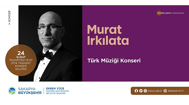 Sakarya Büyükşehir Belediyesi Şubat kültür sanat Etkinlikleri Murat Irkılata’nın türk müziği Konseri ile devam edecek. Müzikseverler ile buluşacak olan Ses Sanatçısı Murat Irkılata, Türk Müziğinden oluşan eserleri dinleyicilerin beğenisine sunacak. Kültür ve Sosyal İşler Dairesi Başkanlığı’ndan yapılan açıklamada 24 Şubat Pazartesi günü Ziya Taşkent Konser Salonu’nda 19.00’da başlayacak olan müzik programına tüm sanatseverlerin davetli olduğu ve biletlerin Kültür ve Sosyal İşler Dairesi Başkanlığı ile kurumsal internet sayfası sakarya.bel.tr üzerinden temin edilebileceği ifade edildi.